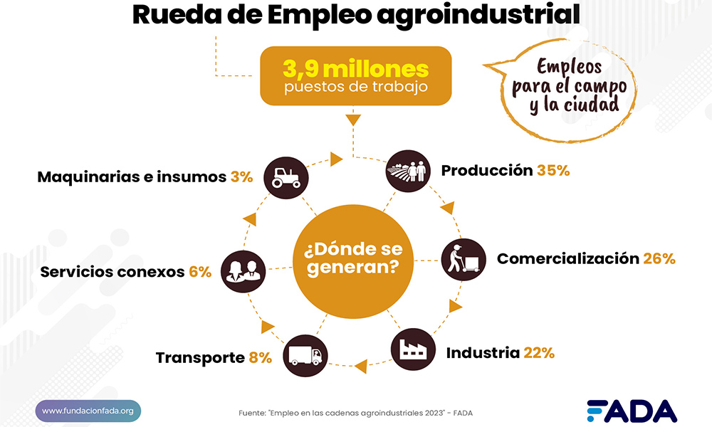 La Fundación Agropecuaria para el Desarrollo de Argentina (Fada) estimó que las cadenas agroindustriales generan casi cuatro millones de puestos de trabajo en el país, lo que representa alrededor del 20% del empleo total nacional.