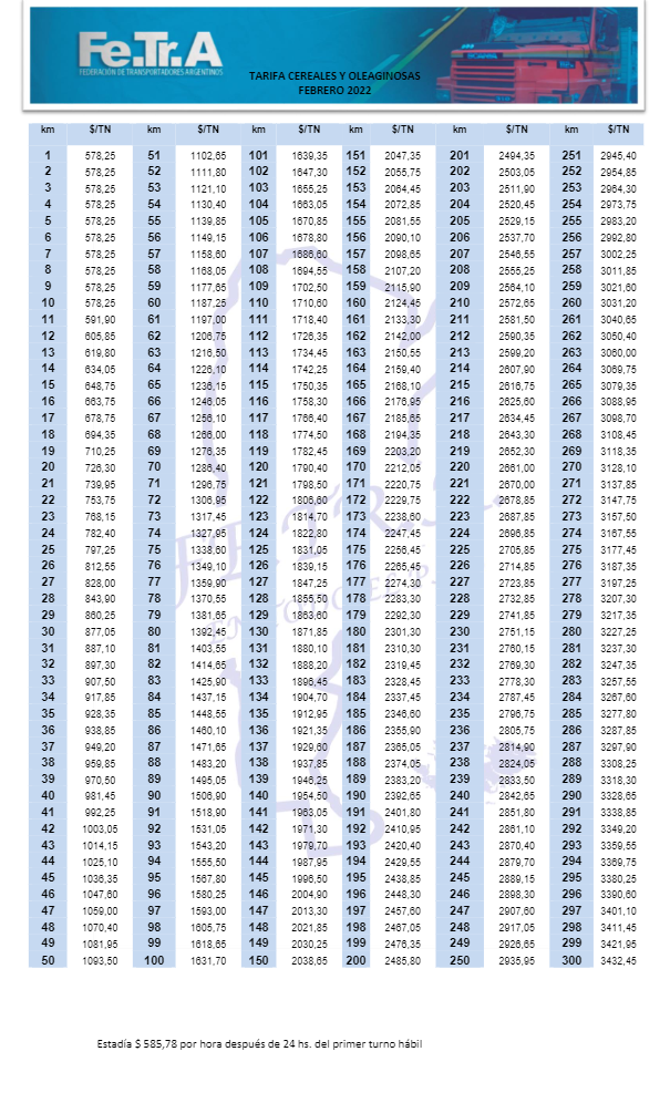 Con el nuevo esquema, para fletes de 100 kilómetros la nueva tarifa de referencia será de 1631,70 $/tonelada (antes era de 1305,36 $/tonelada), mientras que para una distancia de 200 kilómetros ahora es de 2485,80 $/tonelada (antes 1988,64 $/tonelada) y para los 300 kilómetros será de 3432,45 $/tonelada (antes 2745,96 $/tonelada).