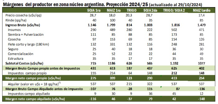 La Guía Estratégica para el Agro de la BCR señala que, al 29 de octubre de 2024, la rotación trigo/soja de segunda lidera los márgenes netos en campo propio, alcanzando 413 u$s/ha con rindes de 40 qq/ha para el trigo, rindes que no serán para todos (en la región se estima 35 qq/ha), y 35 qq/ha para la soja de segunda.