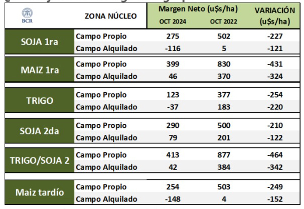 «Comparando con octubre del 2022 se nota que son bajos, realmente bajos. Hace dos años los valores era buenos en la mayoría de los cultivos, cuando la cosecha argentina sufrió uno de los mayores golpes por la falta de agua. A fin de comparar se observa que para campo propio octubre de 2022 mostraba casi el doble de margen respecto a octubre de 2024 en las 6 situaciones», explican desde la BCR.
