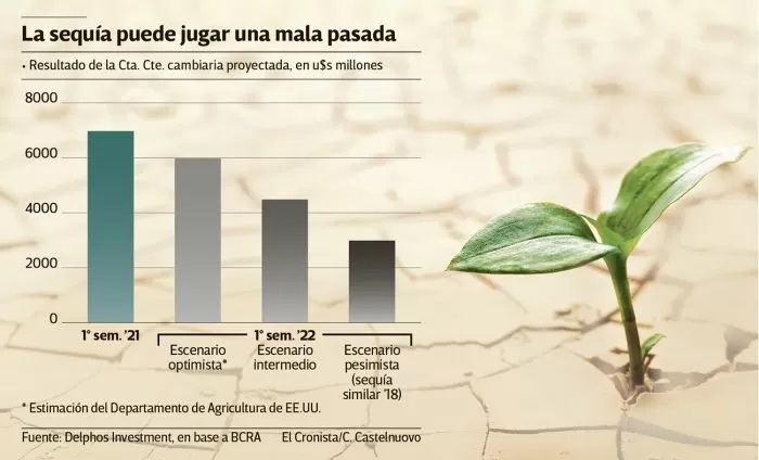 «En el primer escenario, las exportaciones producto de la cosecha gruesa podrían ser superiores a las de la última campaña porque la cosecha de soja aumentaría. En el escenario intermedio, la oferta de divisas derivada de la cosecha gruesa disminuiría en u$s 1500 millones, mientras que en el escenario más pesimista se exportarían u$s 5550 millones menos que en 2020, lo que ciertamente tendría efectos macroeconómicos importantes», estimaron desde Delphos