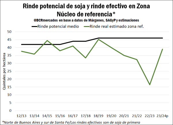 Se viene ampliando la brecha entre rindes potenciales y rindes efectivos de soja, lo cual perjudicó las finanzas del productor. Respecto al arrendador, a pesar de que aumentaron los alquileres, no obtuvo rentabilidades altas en dólares debido a la brecha cambiaria.