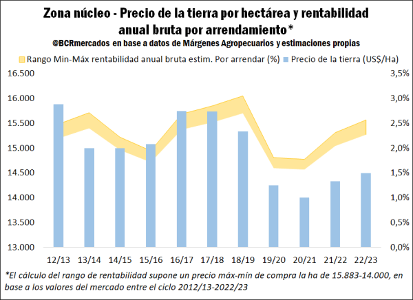 En base a la estimación del monto de alquiler en dólar “billete” de cada año en particular, la rentabilidad final dependerá del precio al cual se compró la hectárea. Para este ejercicio se utilizó un rango de precio de la hectárea entre 14.000/15.883 dólares, siendo valores de mercado que rigieron entre la campaña 2012/13 y 2022/23.