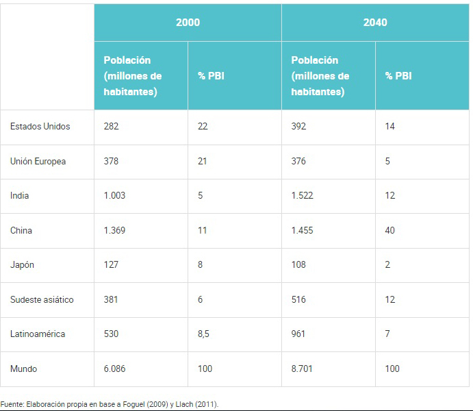 Hacia el año 2040, las economías de China e India en conjunto, explicarán más del 50% del producto mundial, lo que relegará a Estados Unidos, Europa y Japón, al 14%, 5% y 2% respectivamente. Se destaca, asimismo, que el resto de las economías del sudeste asiático, duplicarán su participación en el producto mundial, desde el 6 al 12%. Si bien América Latina experimentará una caída de su participación relativa, en la proyección hacia 2040, mantendrá una participación semejante a Japón y Europa sumados.