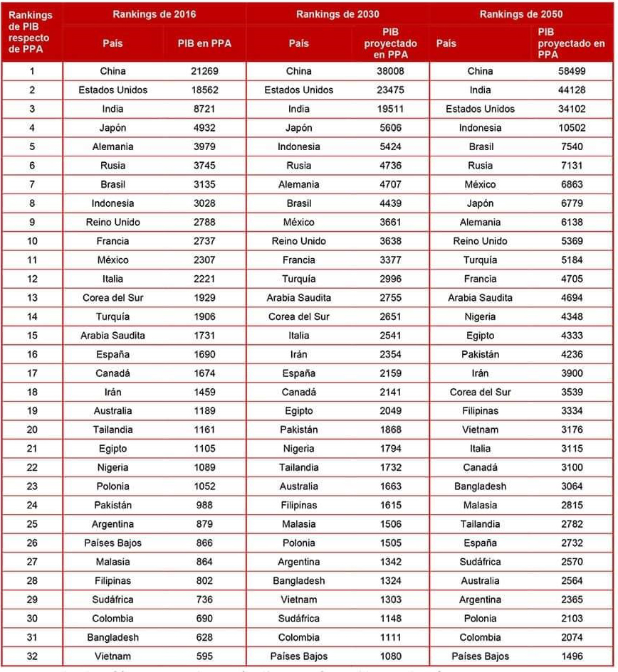 Complementariamente, el informe publicado por PwC (2017) examina la visión a largo plazo desde el interrogante ¿cómo cambiará el orden económico mundial para 2050? y proyecta el crecimiento de las principales 32 economías que explican, en conjunto, el 85% del PIB mundial.