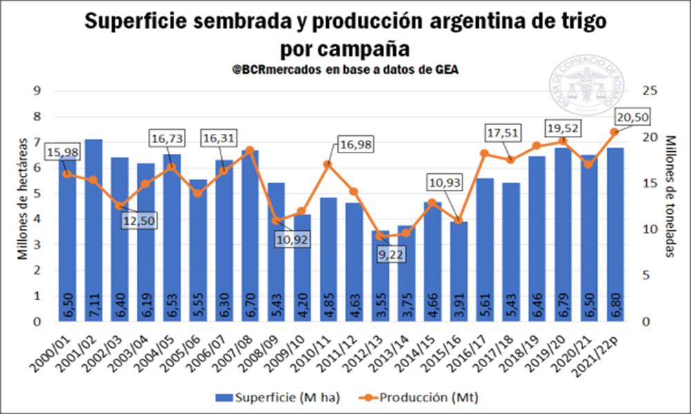 Faltando poco más de 4 meses para el inicio formal de la campaña 2021/22 de trigo, ya se ha sembrado más del 90% de la superficie destinada al cereal. En el informe publicado el día miércoles 14 de julio, la Guía Estratégica para el Agro (GEA-BCR) incrementó su estimación de área a sembrarse pasando de 6,7 M ha a 6,8 M ha, augurando que la siembra cubrirá la mayor extensión de tierra desde el ciclo 2001/02, cuando se sembraron 7,1 M ha. Al mismo tiempo, esto conllevaría a una producción de 20,5 Mt, superando los registros de la campaña 2019/20 por casi 1 Mt de diferencia e instaurando un récord histórico para la producción de trigo pan a nivel nacional. Debe aclararse que estas estimaciones se encuentran sujetas a que se mantengan las favorables condiciones para el cultivo hasta el momento de la cosecha.