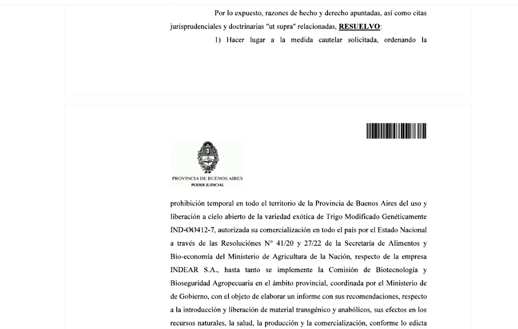 El fallo cuenta con 25 páginas y sostiene que «más allá de las atribuciones competenciales con los que cuenta la secretaría de Alimentos y Bio-economía del Ministerio de Agricultura para la autorización en la liberación comercial de un Organismo Vegetal Genéticamente Modificado, (…) es que tengo por acreditada la exigencia del peligro en la demora, correspondiendo a hacer lugar en consecuencia a la medida cautelar solicitada por el frente activo, bajo la correspondiente contracautela juratoria».
