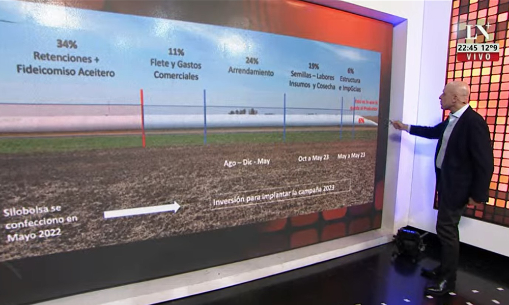 En esta imagen de un silobolsa está el corazón del negocio argentino. Es un gran invento que le abrió el techo al campo, porque ya no se necesita tener gran capacidad de acopio. Se puede hacer en el propio campo, con lo cual se puede producir mucho más. Un productor promedio que arrienda en la zona oeste de la provincia de Buenos Aires, imaginemos General Villegas, de un rinde que no es espectacular, tampoco es malo, en retenciones y aportes al fideicomiso aceitero, se le va el 34%. No de lo que gana sino de lo que tiene, del silobolsa. Eso se lo lleva el Estado. Un 11% se va en flete y gastos de comercio. El arrendamiento le lleva 24%. Las semillas, los insumos, cosechar y otras tareas se llevan el 19%. La estructura administrativa y el impuesto a las ganancias se llevan el 6% del mismo silobolsa. ¿Qué le queda al productor? ¿Con cuánto especula el perverso argentino que siembra soja? Con el 6% de su negocio, con esto hay que vivir”, explica Pagni.
