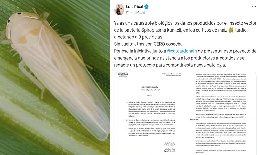 Los diputados nacionales Luis Picat (UCR – Córdoba) y Martín Ardohain (PRO – La Pampa) presentaron esta semana un proyecto de resolución ante la Cámara Baja para que se declare la emergencia agrícola a nivel nacional, a raíz de la expansión de la plaga Dalbulus maidis, conocida como “chicharrita del maíz”.