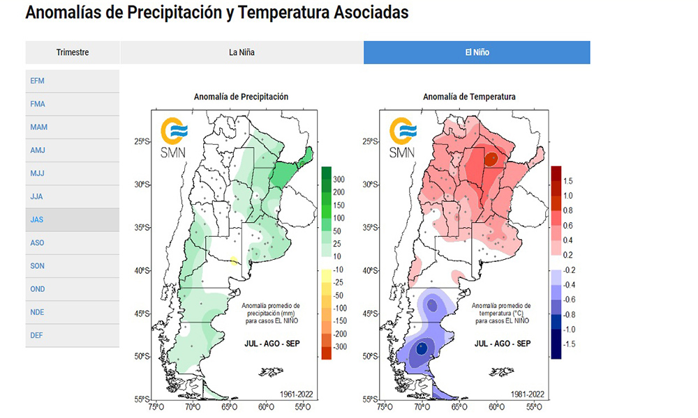 Bajo condiciones de El Niño, el cambio más relevante en cuanto a lluvias para Argentina se observaría entre la primavera y el verano, con precipitaciones por sobre lo normal en el Litoral, la región Pampeana y el noroeste de la Patagonia.