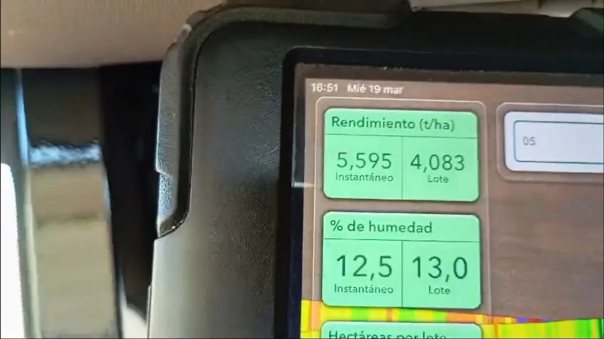 «Normalmente se empieza a fines de marzo. Este año se adelantó un poco, pero después la lluvia volvió a frenar todo», explicó el contratista rural. “Medio sancochaditas, un poco de yuyo… y va la tipa”, agregó en la red social facebook, mientras alterna imágenes del cabezal en plena recolección y el monitor donde se leen picos de casi 60 quintales por hectárea.