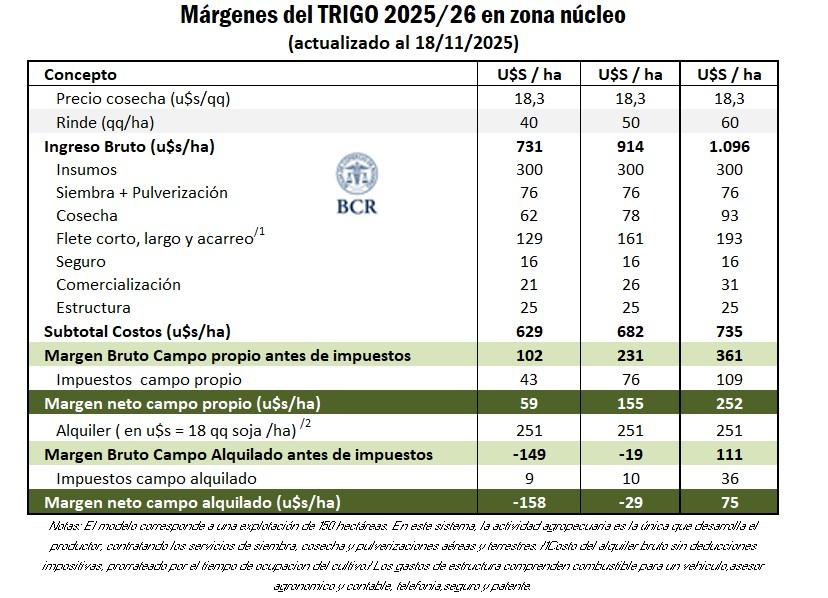 Además, apuntan que en campo alquilado, la rentabilidad del trigo empieza pasando los 50 qq/ha y al mismo tiempo señala que «en la región núcleo alrededor del 70% de la producción se hace en esta modalidad, por eso que se vuelve tan importante evaluar estos resultados».