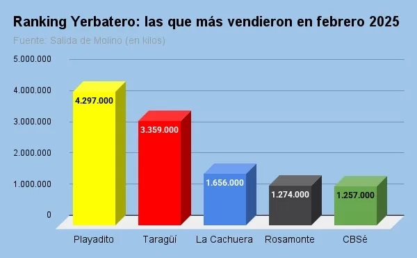 En el mes de febrero, Playadito que es la yerbatera que más vende en el mercado local desde que destronó a Las Marías en la segunda mitad del año pasado, profundizó su liderazgo al vender casi 4.3 millones de kilos, según los despachos de salida de molino.