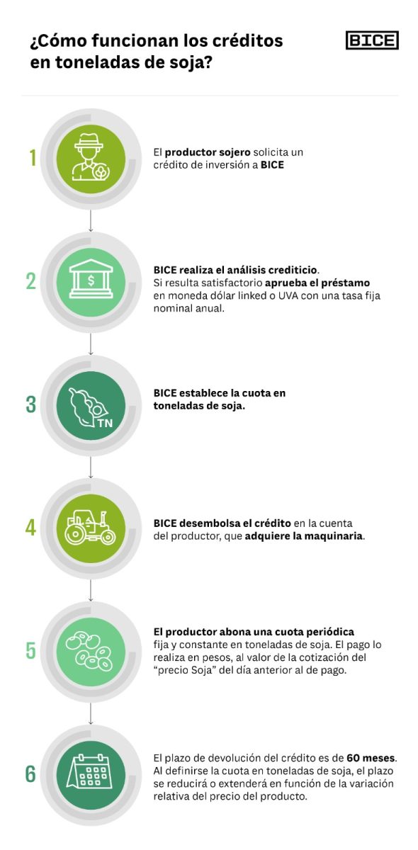 El préstamo, destinado a proyectos de inversión, como la compra de equipamiento nuevo y la construcción de instalaciones productivas, se otorga con un plazo de hasta 60 meses flexible, es decir, que acompaña la evolución del precio de la soja. Esto quiere decir que ante una baja del precio del producto se estira el plazo del crédito y ante una suba se reduce.