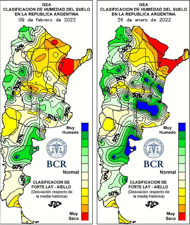 Los técnicos dicen que los rindes pueden desplomarse ante un escenario de escasez en la segunda quincena de febrero. Es decir, «el estado de reservas del suelo para la región núcleo refleja estas dos realidades opuestas y casi podría decirse que es un mapa de rindes de la oleaginosa de primera», agregaron los especialistas.