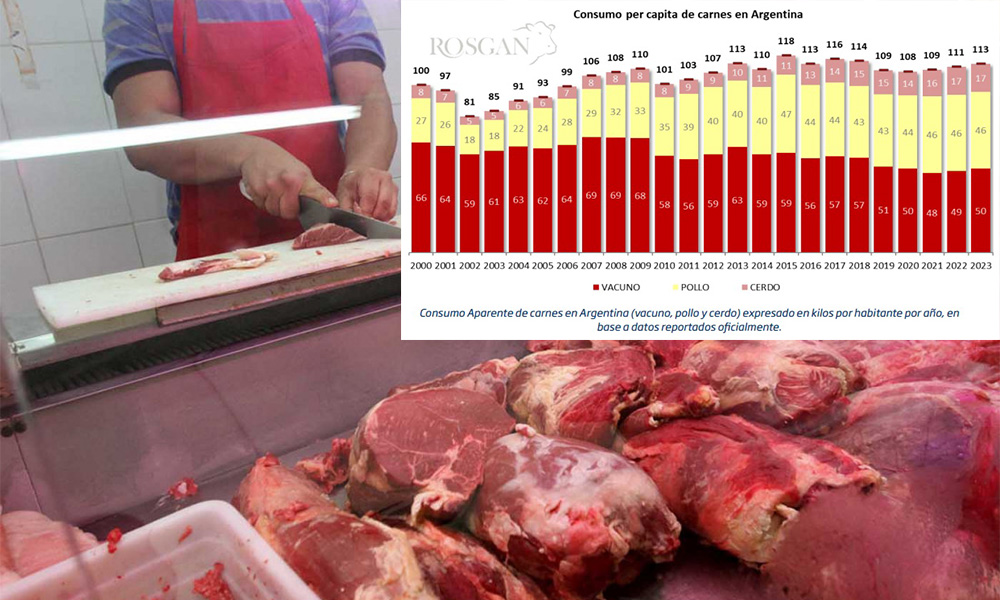 Nuestro país registró en 2023 un consumo total de 113 kilos per cápita de los tres tipos de carnes (vacuna, pollo y cerdo). Así lo manifiesta un informe del mercado ganadero de Rosario, Rosgan, que puntualizó que «frente a un proceso de fuerte deterioro real de los salarios y los aumentos sostenidos en los precios, el consumo de carnes no cayó, sino que aumentó ligeramente», explican.