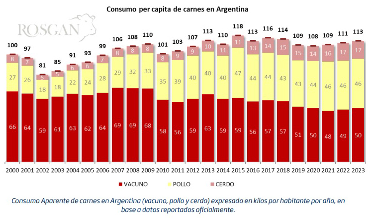 «En 2023, las cifras oficiales suman un consumo total de los tres tipos de carnes de 113 kilos per cápita, aunque en la composición la carne vacuna perdió en comparación con 10 años atrás unos 10 kilos mientras que el pollo y el cerdo aumentaron en promedio entre seis y siete kilos, respectivamente», precisó Rosgan en un relevamiento publicado a mediados de semana.