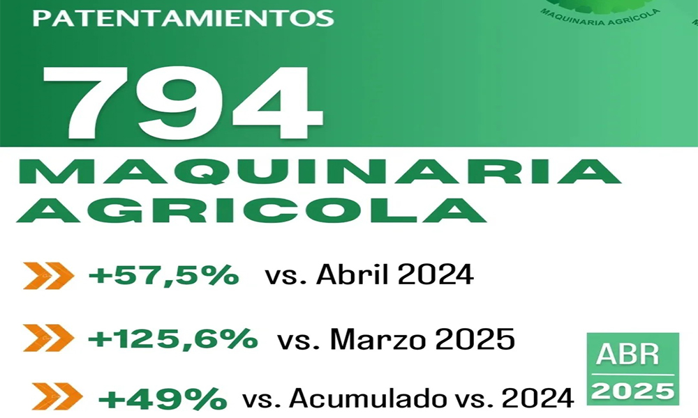 Según un informe de la Asociación de Concesionarios Automotores de la República Argentina (ACARA), en abril se patentaron 794 unidades de maquinaria agrícola, contra las 504 que se habían patentado en el mismo mes de 2024. Asimismo, en términos mensuales se vislumbró un gran salto del 125,6 por ciento.