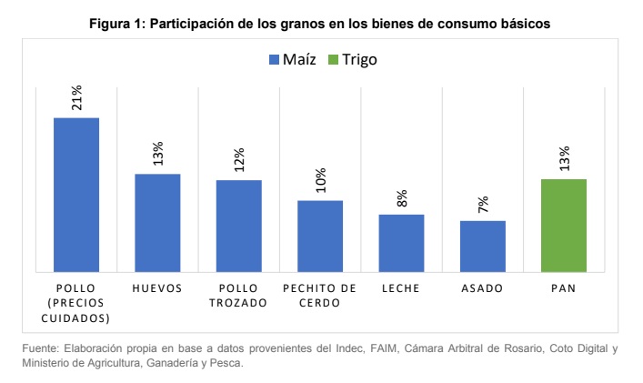 Estableciendo una situación hipotética e improbable, si mañana el maíz y el trigo se regalan a las industrias, el pollo entero de precios cuidados se podría abaratar 21%, los huevos 13%, pollo trozado 12%, pechito de cerdo 10%, el litro de leche 8%, asado 7%, y el pan 13% más barato. Valores porcentuales que demuestran que ni en el caso más inverosímil los alimentos bajarían de precio lo suficiente para que se ajusten a los sueldos promedios de la Argentina.
