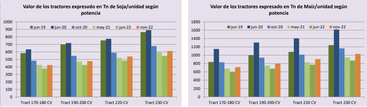 En el caso de tractores, para adquirir una unidad de 230 CV, el costo medido en soja era de 550 toneladas de soja en junio y 600 toneladas del poroto en noviembre.