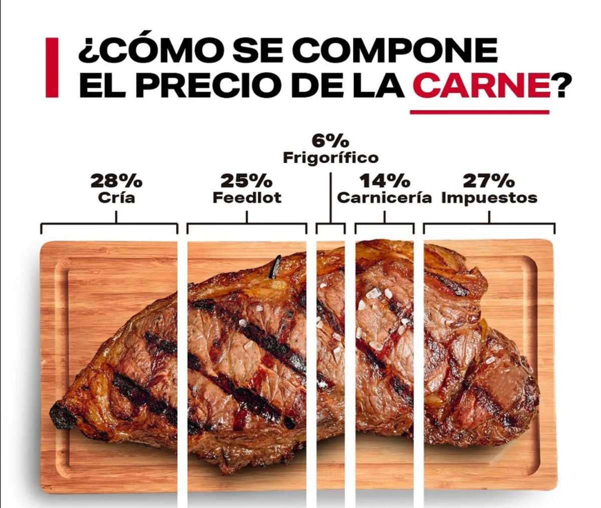 Del precio que paga el consumidor por el kilo de carne, la cría representa el 28%, el feedlot 25%, frigorífico 6%, carnicería el 14% y los impuestos el 27%. El maíz representa 11% del precio del kilo de carne vacuna al mostrador.