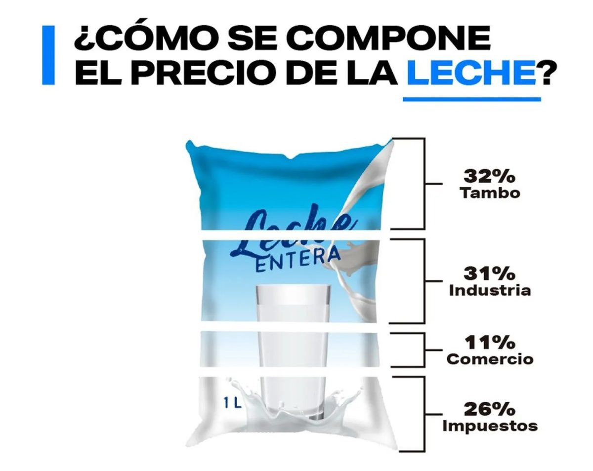 El trabajo arroja que, en el precio del sachet de leche entera, el tambo representa el 32%, la industria el 31%, el comercio 11% e impuestos el 26%. “Dicho de otro modo: para el mes de la medición, en promedio el sachet tuvo un precio de $164, de los cuales $43 son impuestos”, aclaró Ariño. El maíz constituye el 16% del precio de la leche cruda (tambo) y el 5% del sachet.