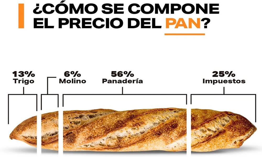 Uno de cada cuatro pesos del valor del pan, la carne y la leche son impuestos, de los cuales el 75% corresponden a tributos nacionales. Por ello, en el caso del pan, por ejemplo, el precio se multiplica 7,3 veces desde el campo a la venta al público, ya que el trigo representa solo un 13% del precio de este alimento.