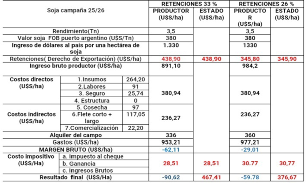 Pero el tema más inquietante es que el Estado, por el concepto de retenciones a la exportación de soja, se lleva 345,90 por cada tonelada de soja y el productor, alejado del puesto, pierde 59 dólares.
