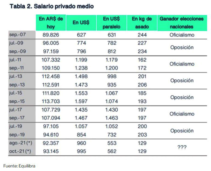 El informe muestra que desde el 2007 el poder adquisitivo del salario privado medio en kilos de asado inició un camino de descenso, con altibajos y sin importar la gestión: 244 kilos en septiembre 2007, 172 kilos en septiembre de 2011, 206 kilos en septiembre de 2013, 193 kilos en septiembre de 2015, 197 kilos en septiembre de 2017 y 203 kilos en septiembre de 2019. Mientras que para agosto y octubre de este año, llegaría a 129 kilos.