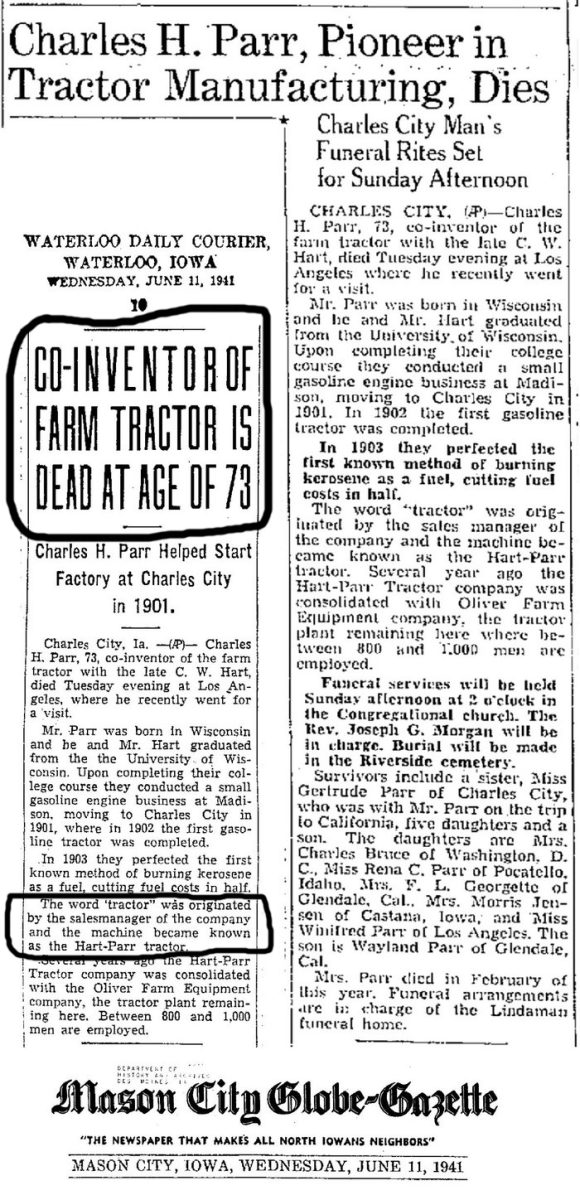 En una página de ese diario hay dos notas referidas al fallecimiento de Charles Parr, en la de la izquierda que lleva por título “Co-inventor of farm tractor is dead at age of 73” (Muere el co-inventor del tractor a los 73 años), en una parte de la nota textual dice: La palabra «tractor» fue acuñada por el director de ventas de la empresa y la máquina pasó a ser conocida como tractor Hart-Parr.