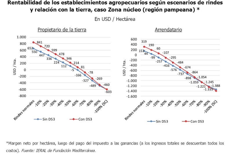 En efecto, se encuentra que a un productor propietario de zona núcleo que en esta campaña logra rindes un 40-60% por debajo de los normales, el DS3 le genera una mejora en el margen neto en torno a los u$s 100 por hectárea; por su parte, para aquellos productores propietarios con rindes entre 70% y 90% por debajo de los normales, que ya exhibían pérdidas económicas antes de la medida, el DS3 reduce las mismas entre u$s 30 y u$S 87 por hta., es decir, no logra revertir los números rojos pero sí atenuarlos. Como se mencionase, la medida no genera beneficio en aquellos productores propietarios que pierden el 100% de su cosecha (la pérdida se mantiene en u$s 603/hta).