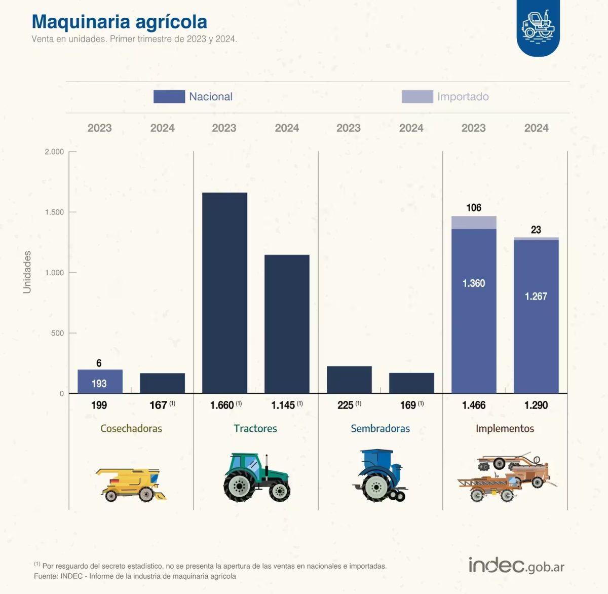 Según datos del Instituto Nacional de Estadísticas y Censos (INDEC) la venta de unidades maquinaria agrícola en el primer trimestre de 2024, descendieron un 16,1% interanual. En cosechadoras, cayó un 24,9% en sembradoras, un 12% en implementos y un 31% en tractores.