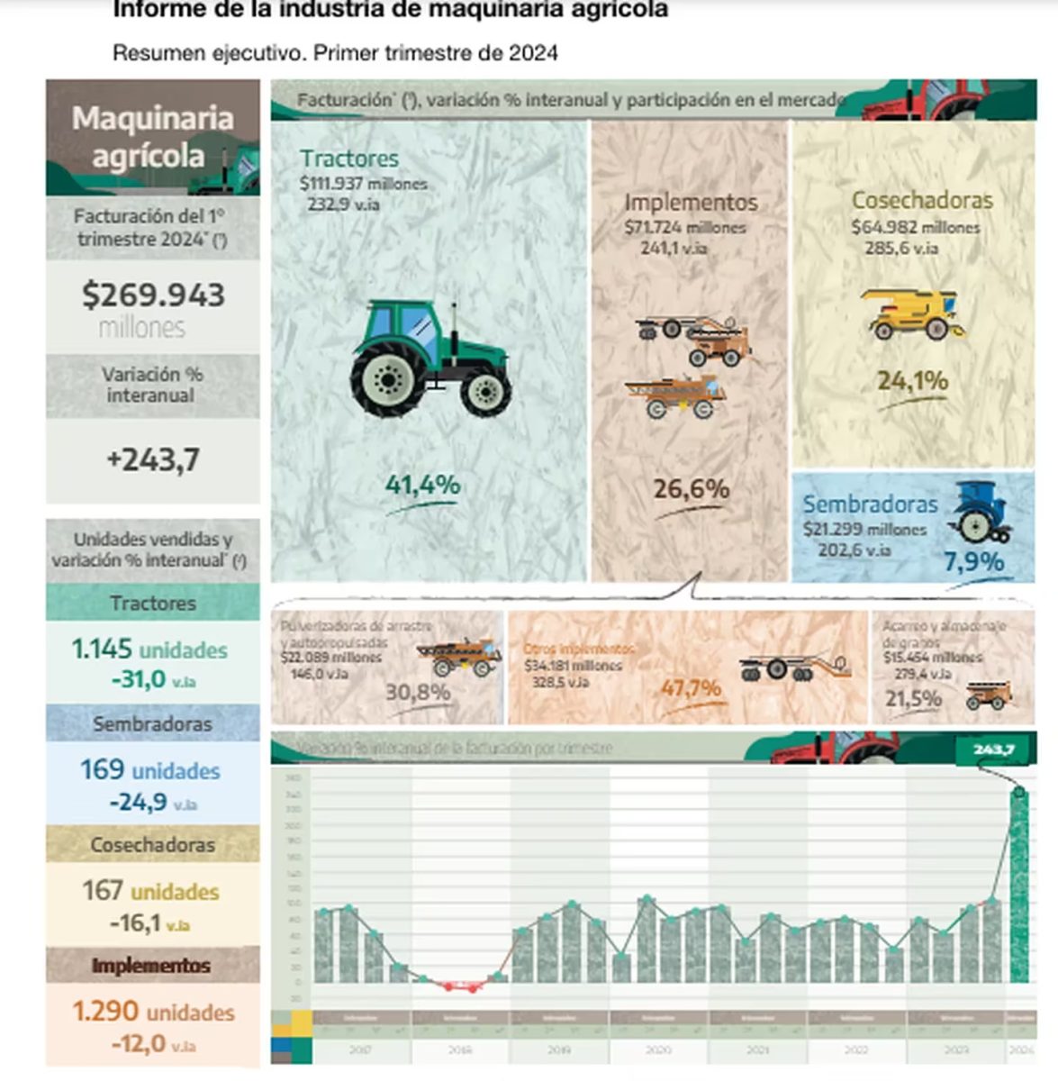 Asimismo, tractores y cosechadoras lideraron en facturación, pero estos incrementos están por debajo de la inflación, mostrando una situación económica que sigue siendo desfavorable para los productores.