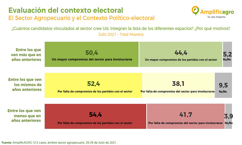 Por otro lado, más de la mitad de los consultados (52,4%), consideró que la presencia de candidaturas ligadas al sector es menor a lo que venía sucediendo en los últimos años, y la principal responsabilidad la observan en la falta de compromiso de los partidos políticos, mientras que el 44,4% cree que es por la falta de compromiso del sector.