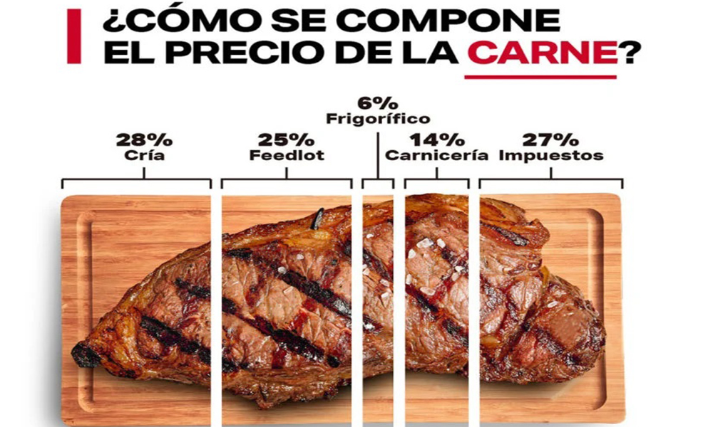 Del precio que paga el consumidor por el kilo de carne, la cría representa el 28%, el feedlot (que es el proceso de engorde) 25%, el frigorífico 6%, la carnicería el 14% y los impuestos el 27%.