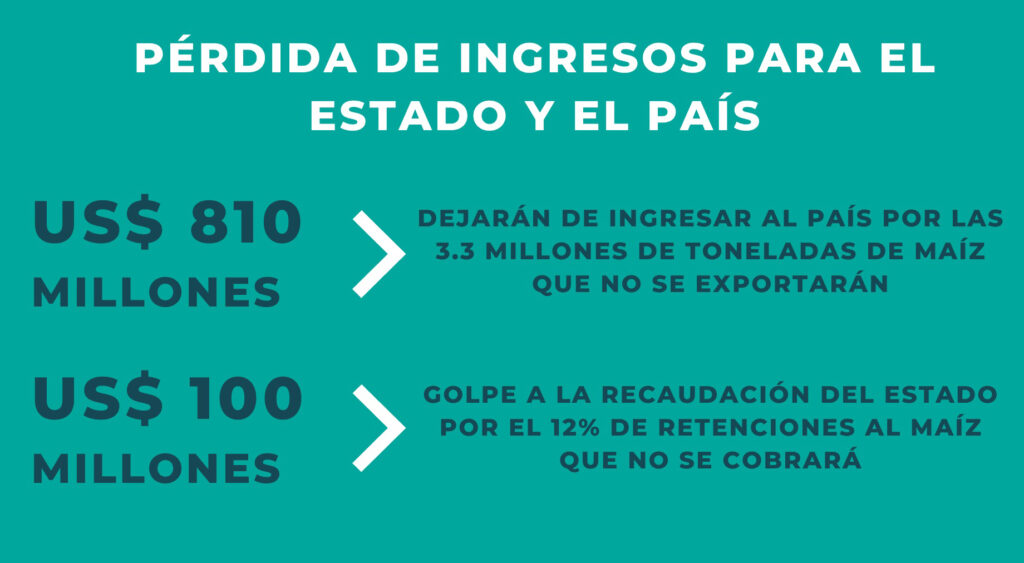 Agregó que en el momento de detener los embarques de maíz durante enero y febrero ya se habían exportado 34,2 millones, por lo que «esos 3,3 millones de toneladas que no se van a exportar son alrededor de u$s 810 millones que dejarán de ingresar al país».
