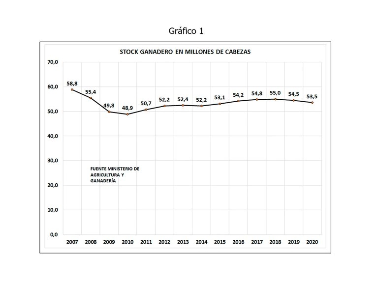 De acuerdo a datos del Ministerio de Agricultura y Ganadería, entre 2007 y 2010 se perdieron casi 10 millones de cabezas de ganado que nunca pudieron recuperarse. El dato a diciembre de 2020 muestra que volvió a caer respecto a 2019 y se ubicó en 53,5 millones de cabezas. Es decir, solo se logró recuperar el 50% del stock ganadero perdido.