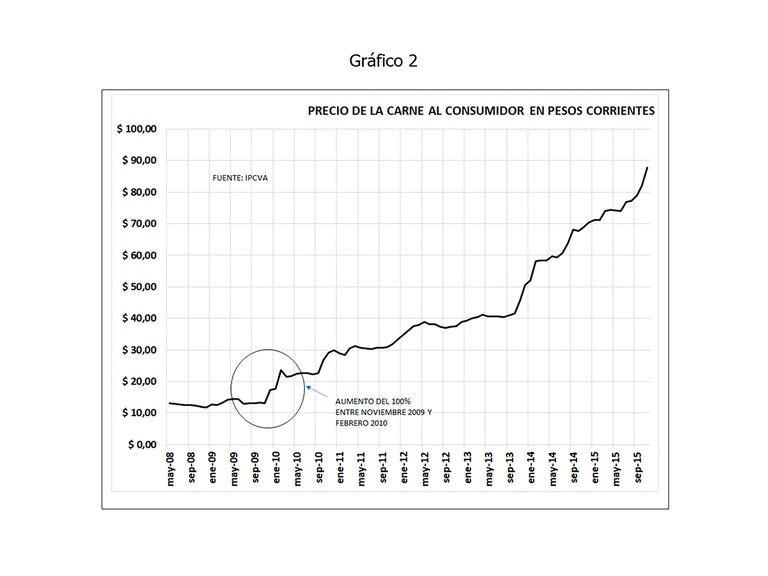 En efecto, entre noviembre de 2009 y febrero de 2010 el precio del asado (se tomó ese corte por ser de consumo interno) se duplicó. En tres meses solamente la carne al mostrador subió el 100% y luego continuó el recorrido alcista.
