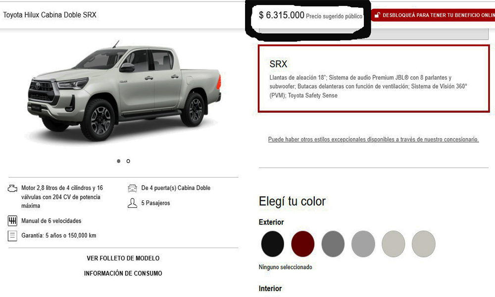El resultado de la ecuación está determinado por el valor oficial de la propia empresa Toyota en su página web al día 5 de diciembre, el cual dice que una camioneta Hilux SRX, cabina doble, tiene un precio sugerido al público de $ 6.315.000.