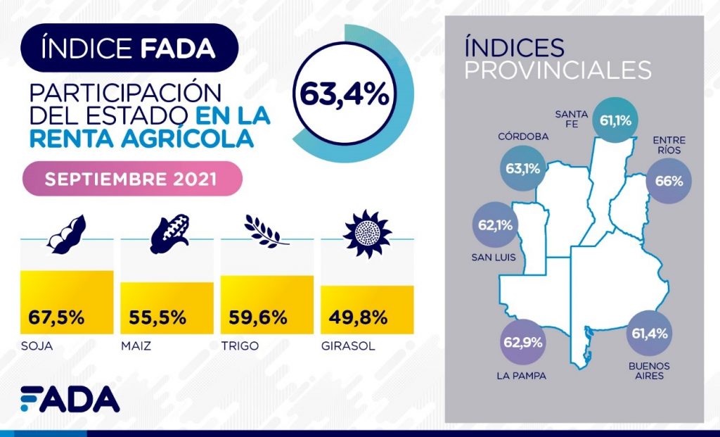 La medición de septiembre de 2021 marca una participación de los impuestos sobre la renta agrícola del 63,4% para el promedio ponderado de los cultivos de soja, maíz, trigo y girasol.