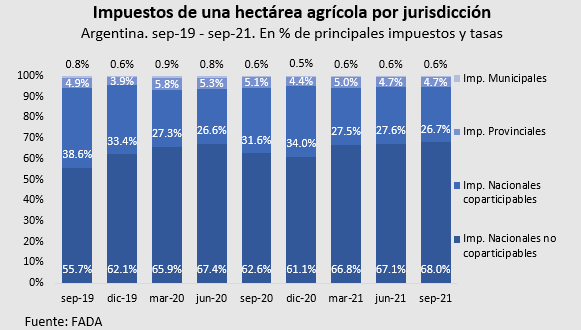 El 63,4% de participación del Estado, está compuesto por impuestos nacionales, provinciales y municipales. Los impuestos nacionales no coparticipables representan el 68% del total de impuestos que afronta una hectárea agrícola en Argentina. La composición central de estos impuestos son los derechos de exportación, a los que se le suma el impuesto a los créditos y débitos bancarios. Este es el mayor nivel desde 2019, momento en que FADA lo mide como parte de este informe.