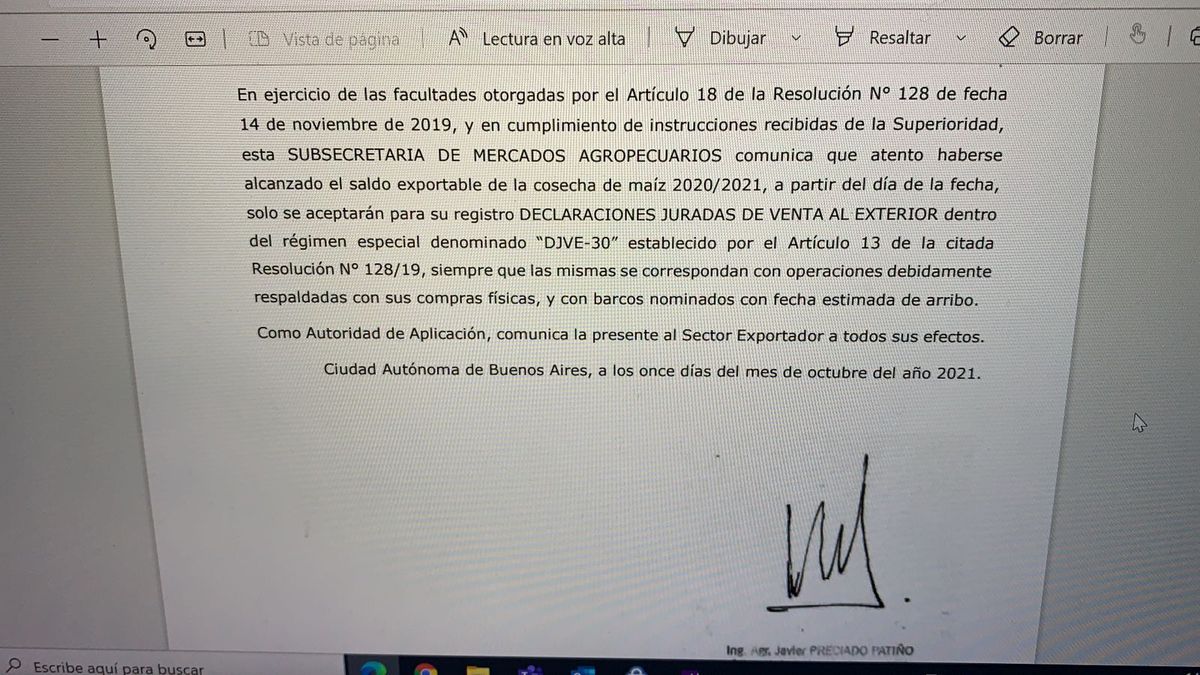 «En ejercicio de las facultades otorgadas por el Artículo 18 de la Resolución N°128 de fecha de 14 de noviembre de 2019, y en cumplimiento de las instrucciones recibidas de la Superioridad, esta Subsecretaría de Mercados Agropecuarios comunica que atento haberse alcanzado el saldo exportable de la cosecha de maíz 2020/21, a partir de la fecha, solo se aceptarán para su registro declaraciones juradas de venta al exterior dentro del régimen especial denominado «DJVE-30″ establecido por el artículo 13 de la citada resolución N°128/19, siempre que las mismas se correspondan con operaciones debidamente respaldadas con sus compras físicas, y con barcos nominados con fecha estimada de arribo».