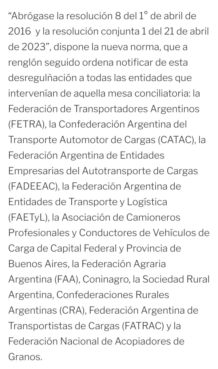Según dijeron en la normativa, a lo largo de los años se habían establecido mecanismos de referencia. Esta resolución también había creado la “Mesa de Negociación Participativa”, un mecanismo para determinar la Tarifa de Referencia, integrada por cámaras empresariales del sector, entidades agrarias, y representantes de la Subsecretaría de Transporte Automotor y del entonces Ministerio de Agroindustria.