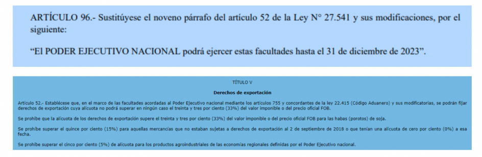 La Fundación Barbechando mediante un comunicado dio a conocer que alertó a los legisladores nacionales que el proyecto de ley de Presupuesto 2023 propone que el Poder Ejecutivo Nacional podrá ejercer las facultades de fijar Derechos de Exportación hasta el 31 de diciembre de 2023, retomando las facultades que tenia en la Ley N° 27.541/19 (Ley De Solidaridad Social y Reactivación Productiva), que permitió al gobierno fijarlos hasta el 31 de diciembre de 2021.