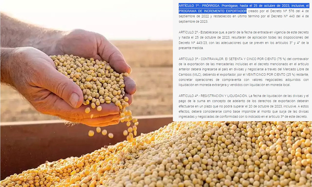 El Gobierno publicó hoy el decreto que prorroga el programa “Dólar soja 4”, hasta el 25 de octubre de 2023, inclusive.