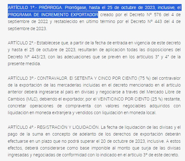 En ese contexto, este lunes se oficializó la medida a través del Boletín Oficial con el Decreto 492/2023. El cual, entre otros aspectos, se prorroga y amplía el Programa de Incremento Exportador, que busca por medio de una serie de medidas aumentar las exportaciones.