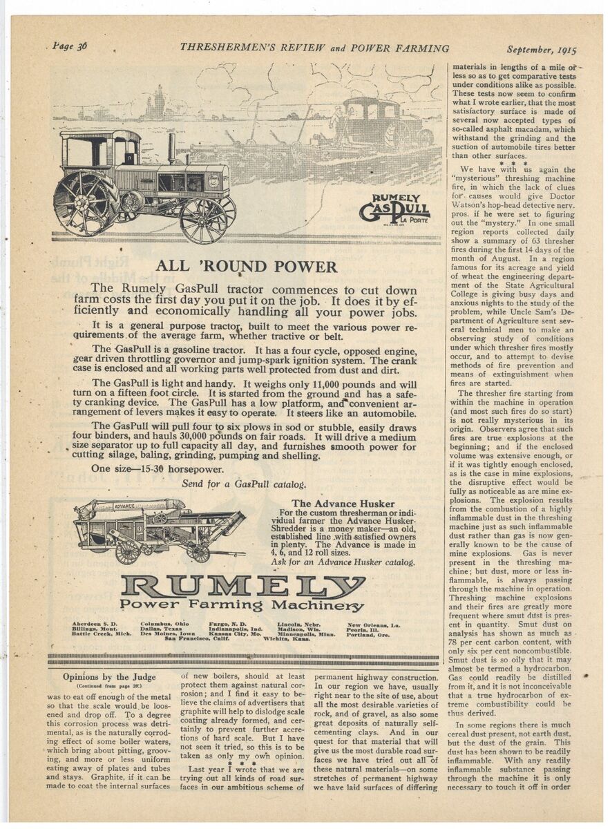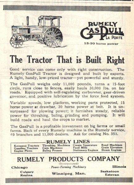 En 1912, la Rumely compró la empresa Northwest Thresher Co. de Minnesota, que fabricaba la tractor marca Universal 20-40 (20 Hp a la barra de tiro y 40 Hp a la polea). Este tractor fue rebautizado y pasó a llamarse: Rumely GasPull y al mismo tiempo la empresa Rumely comenzó a fabricar el tractor de la Tapa de esta revista, es decir el Rumely GasPull 15-30 (15 Hp a la barra de tiro y 30 Hp a la polea).