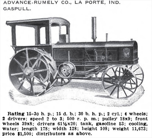 En 1915, la empresa Rumely atravesó dificultades financieras y se reorganizó como Advance Rumely and Company. En 1927, su línea incluía trilladoras de granos, trituradoras de maíz, máquinas de vapor, tractores, cosechadoras combinadas, camiones ligeros y camiones cisternas de combustible y agua.