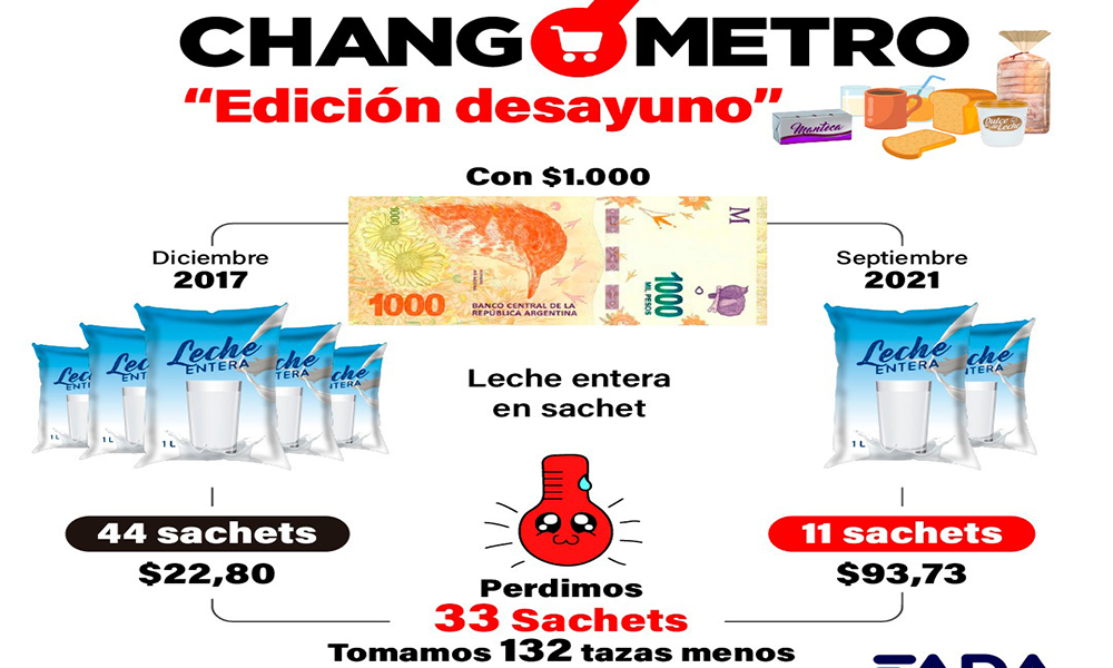 Por su parte, el equipo de economistas de FADA (Fundación Agropecuaria para el Desarrollo de Argentina), esta semana publicó lo que denominaron el “Changódromo edición Desayuno”, un trabajo pormenorizado que analiza cómo la inflación golpea a los argentinos desde el mismo momento en que se dispone a desayunar.