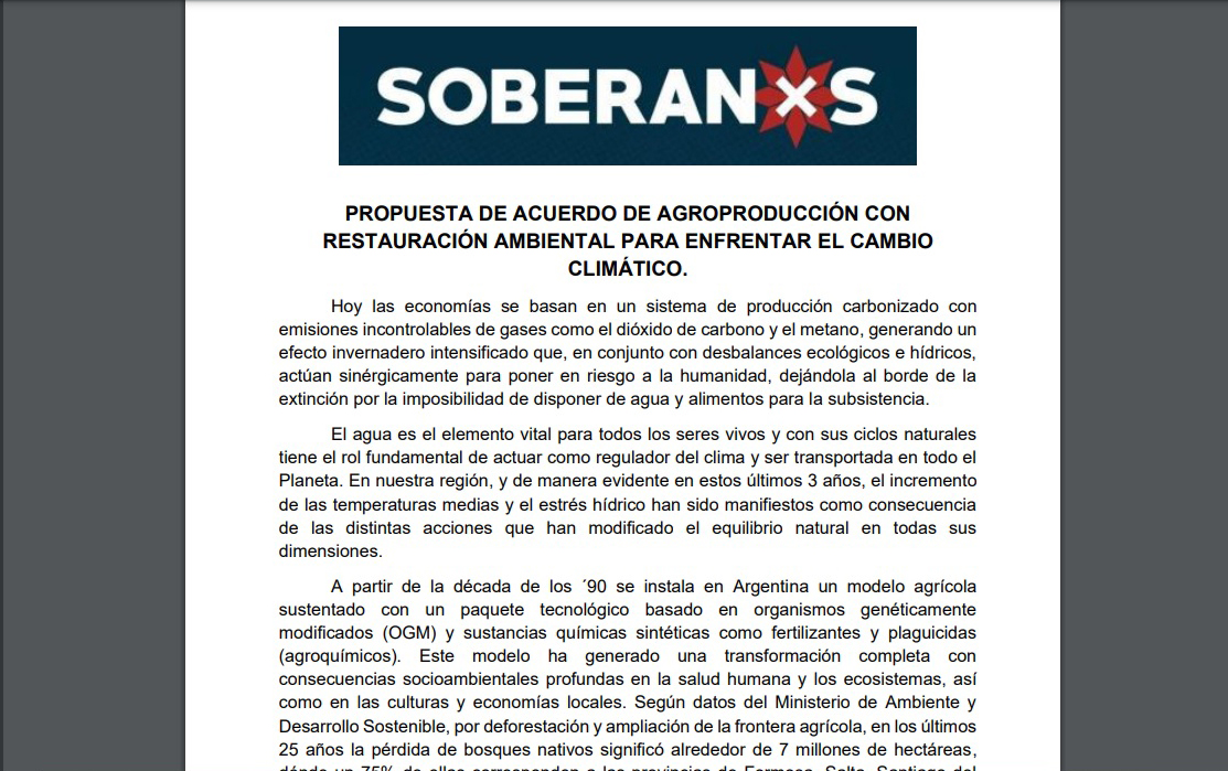 Por todo esto, los militantes que integran Soberanxs -gran parte de ellos dirigentes o ex dirigentes del Frente de Todos que no encuentran representación en Alberto Fernández, sino que son más cercanos a Cristina Kirchner- propusieron que ante la solicitud de subsidios y ayuda económica de los productores al Estado nacional, tengan compromisos con objetivos de corto, mediano y largo plazo para combatir estos efectos del cambio climático.